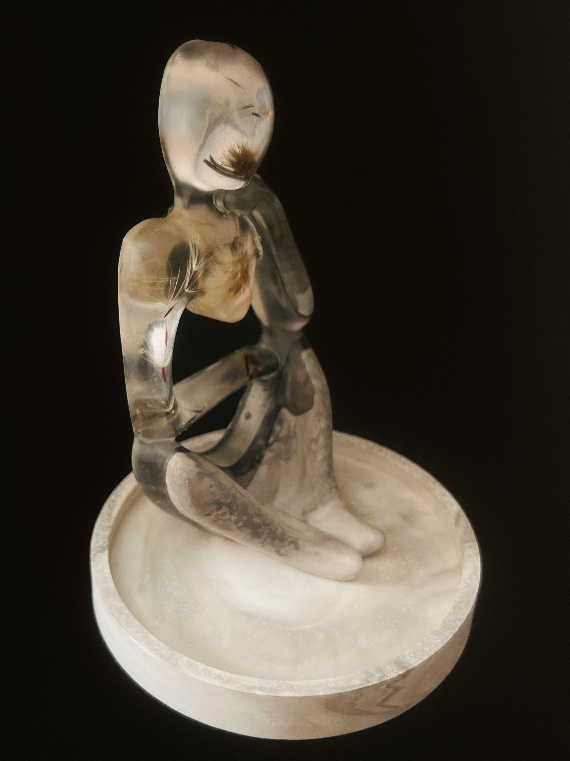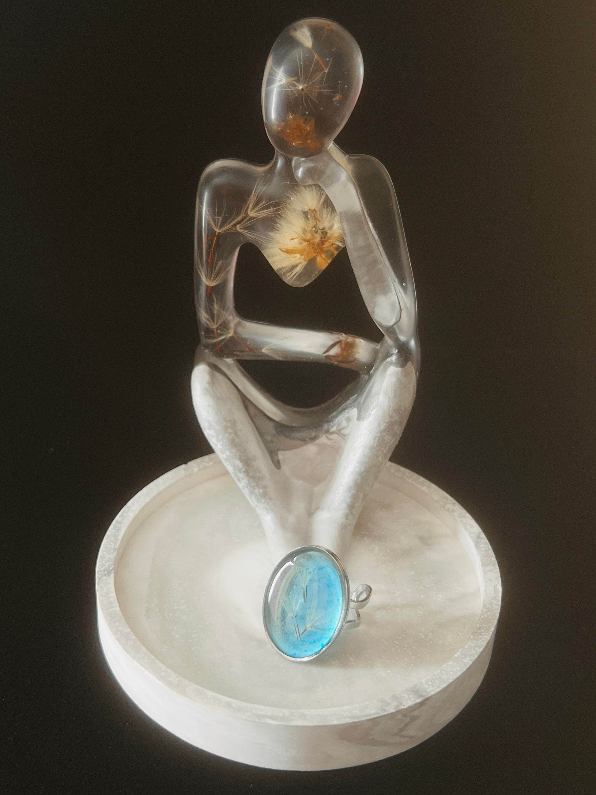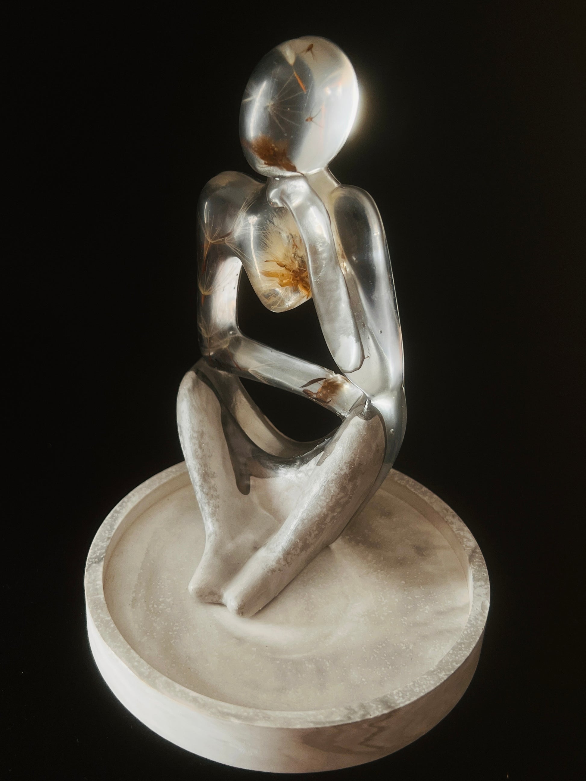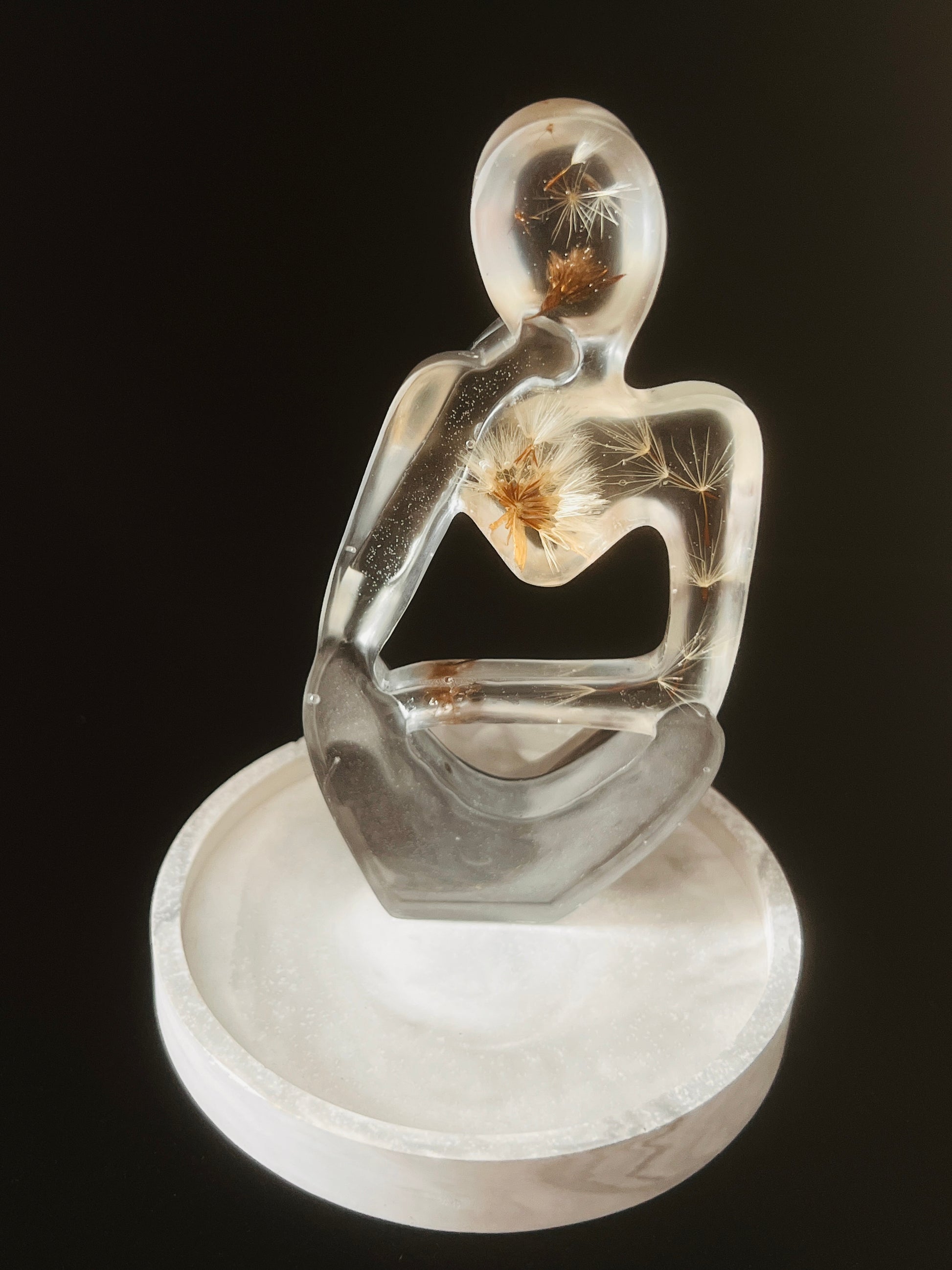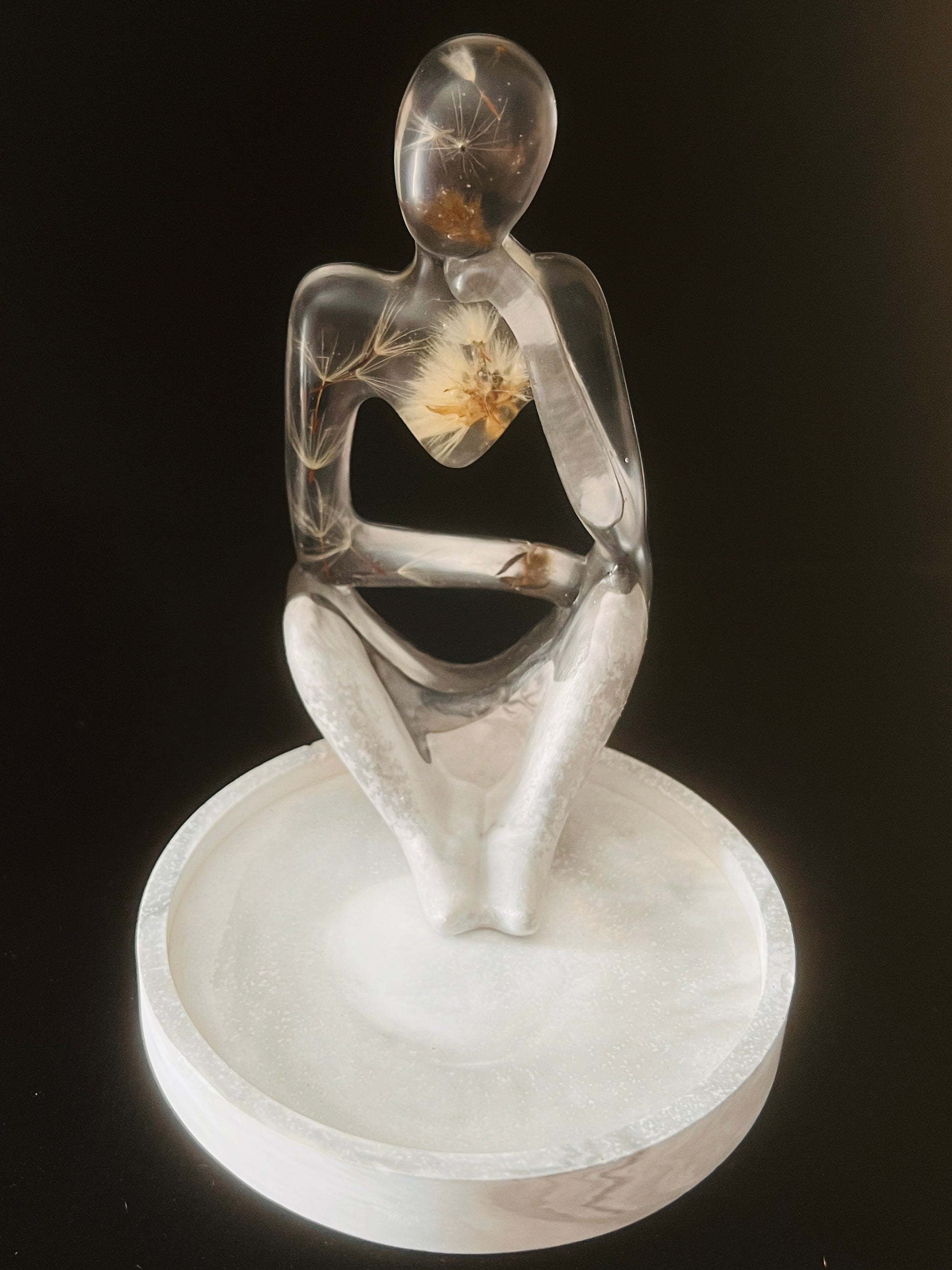 Introducing the Dandelion Thinker--a unique art piece that blends hand craftsmanship with a mix of mediums. This piece is encased with natural dandelions, creating a one-of-a-kind, captivating masterpiece. From the thoughtful design to the intricate detail, this art piece will be sure to spark conversation and admiration!